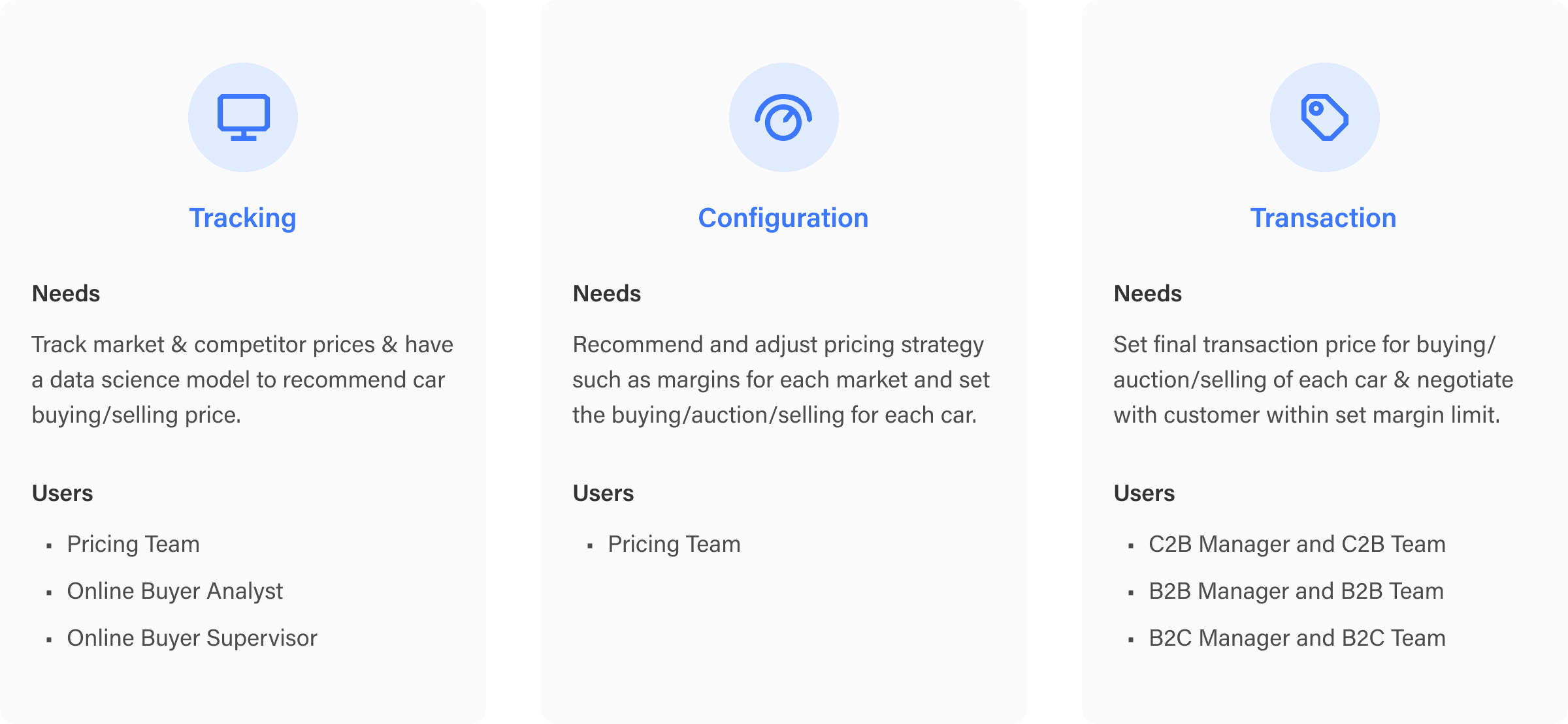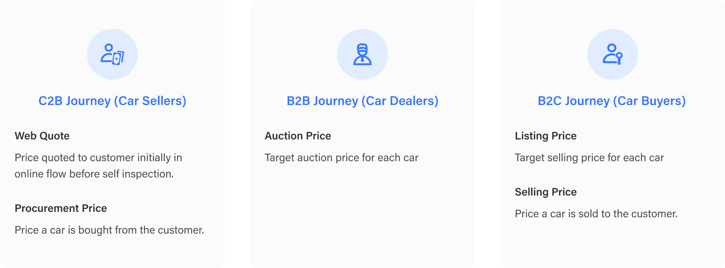 The car's journey in our system consists of three distinct stages. Each stage requires taking multiple strategic decisions such as the margins to be achieved, usage and damage related factors to be considered, etc.