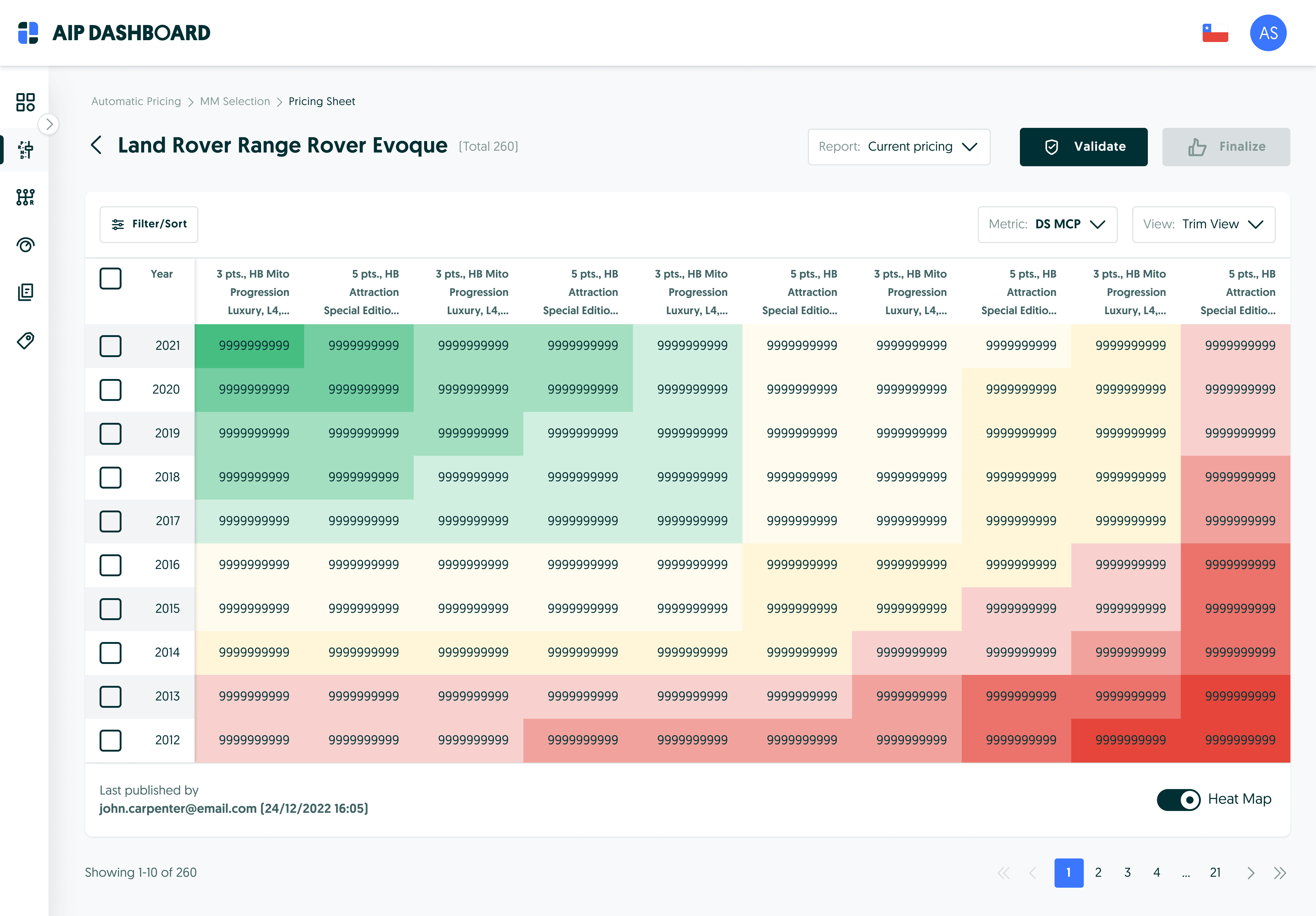 Furthermore, it highlights pricing inconsistencies and provides an option for users to activate a heat map, making it convenient to visualise any inconsistencies in trim prices.