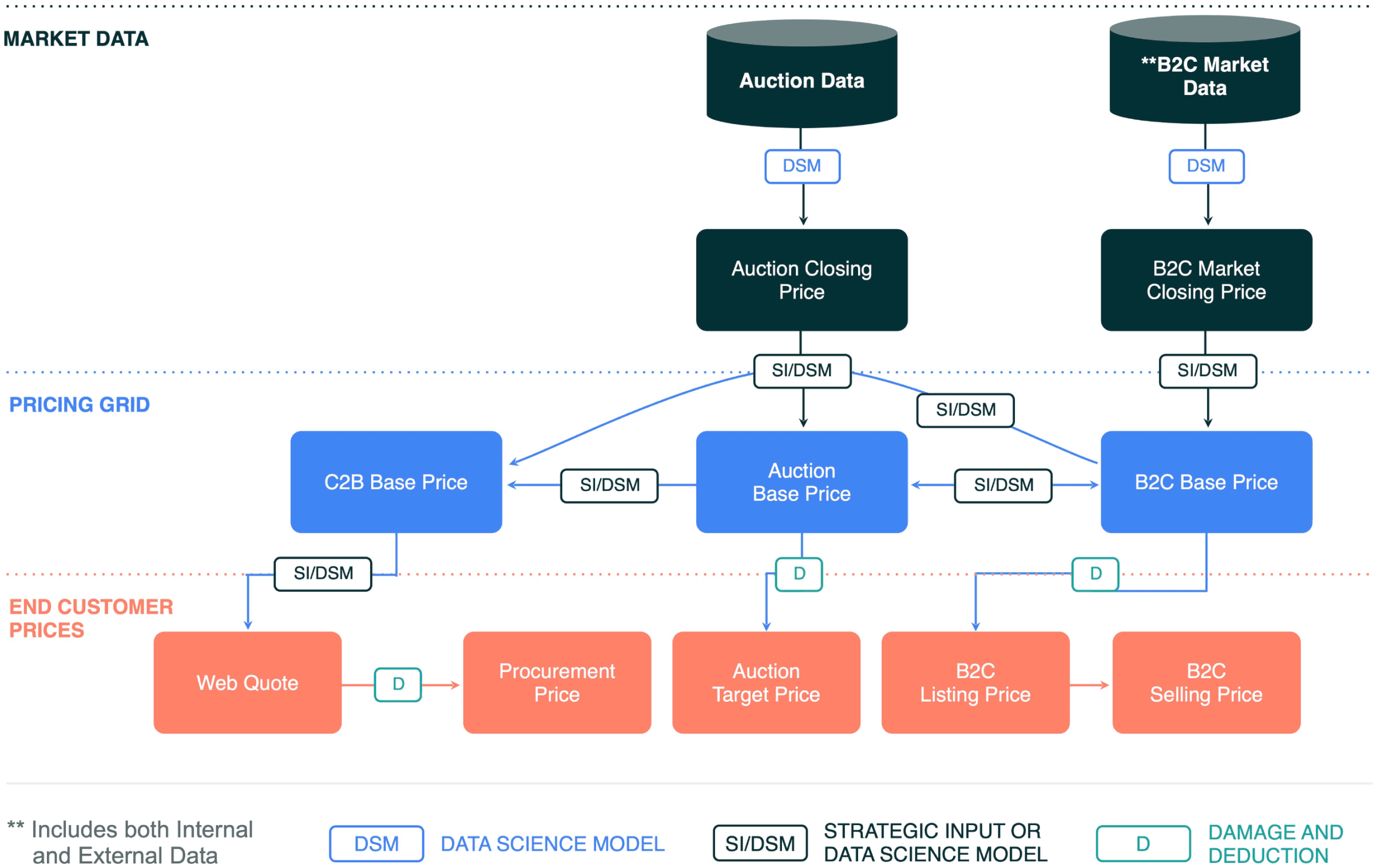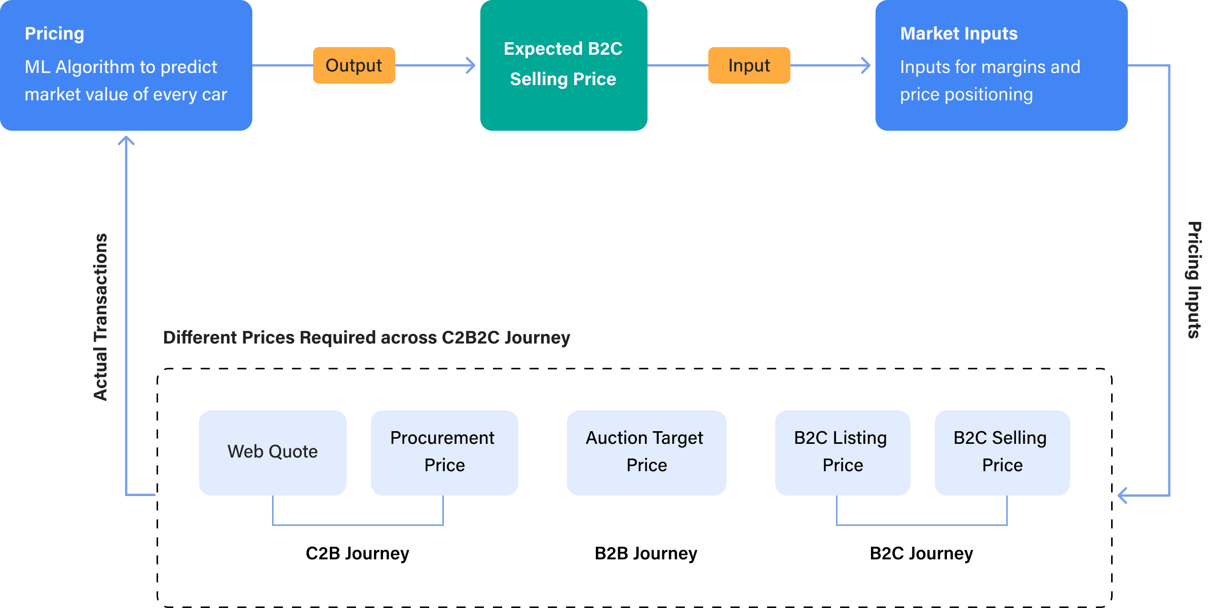 A feedback-based self-learning loop provides the base price for setting transaction prices throughout the car's C2B (Buying), B2B (Auction), and B2C (Selling) journey.